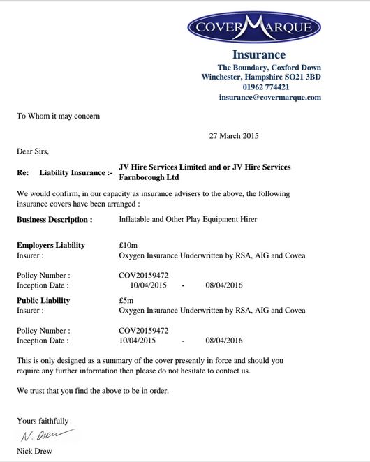 3924993 - DOA Insurance Certificate - Bouncy castle Hire In ...